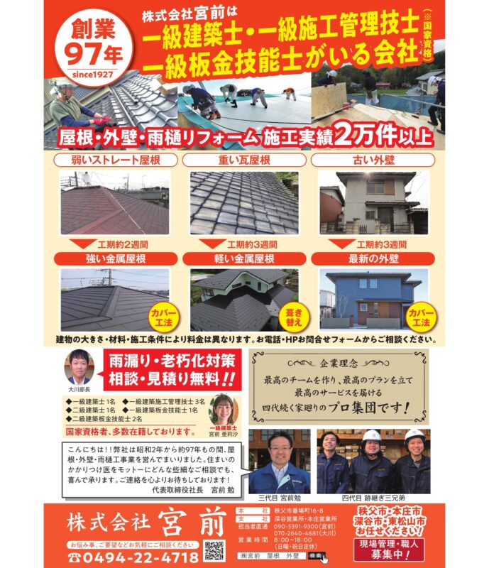 弊社は一級建築士をはじめとする国家資格保有者が多数在籍し、お客様の大切な住まいを屋根・外壁・雨樋の修理交換から雨漏り対策、防水工事、内装リフォームまで、幅広くサポートして参りますので今後ともどうぞよろしくお願い申し上げます。